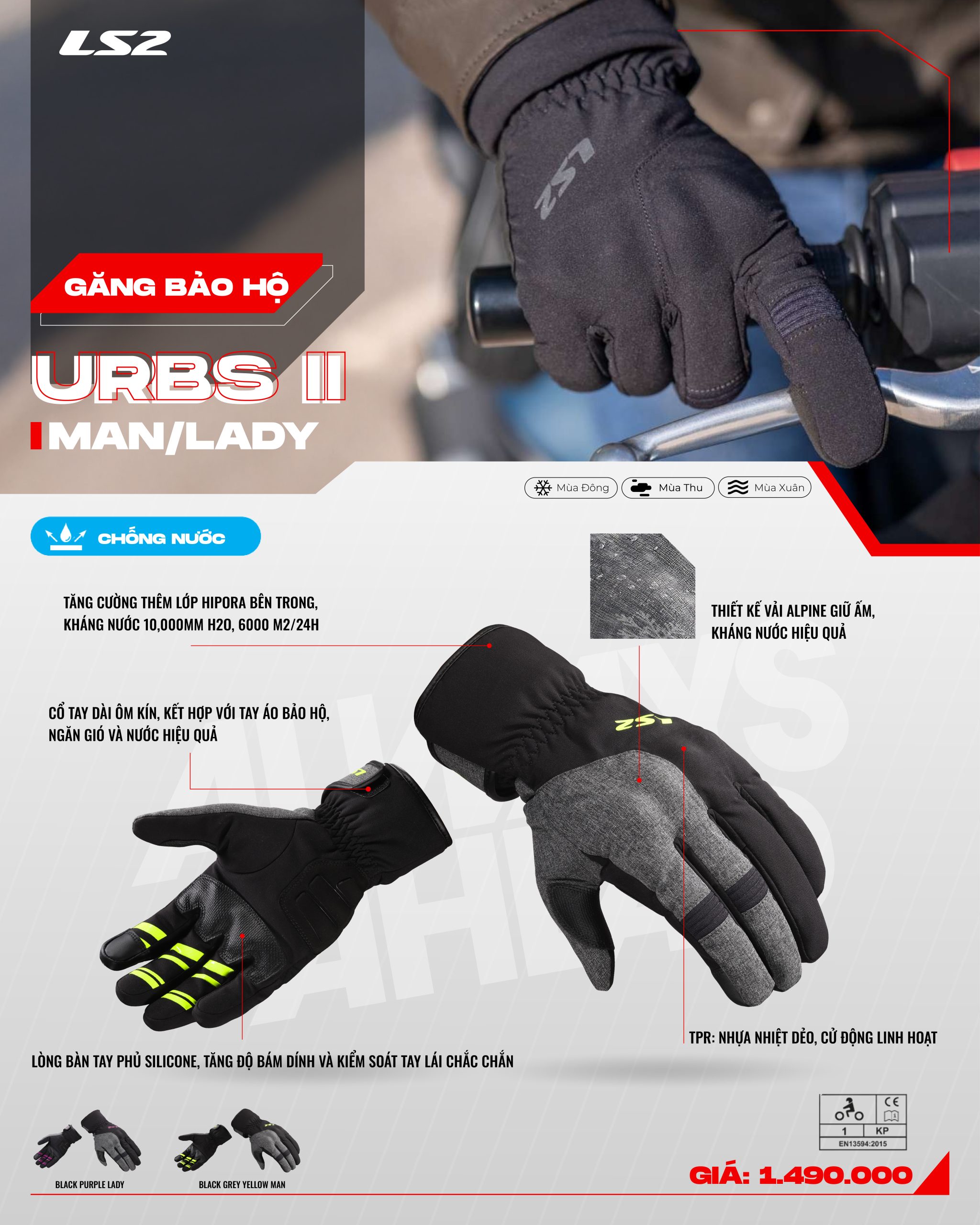 Thiết kế unisex cho cả nam và nữ, hoàn thiện tính năng chống nước, giữ ấm, bám lái chắc vững lái, tự tin hơn trong điều kiện thời tiết xấu.